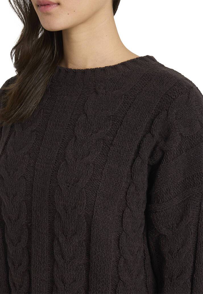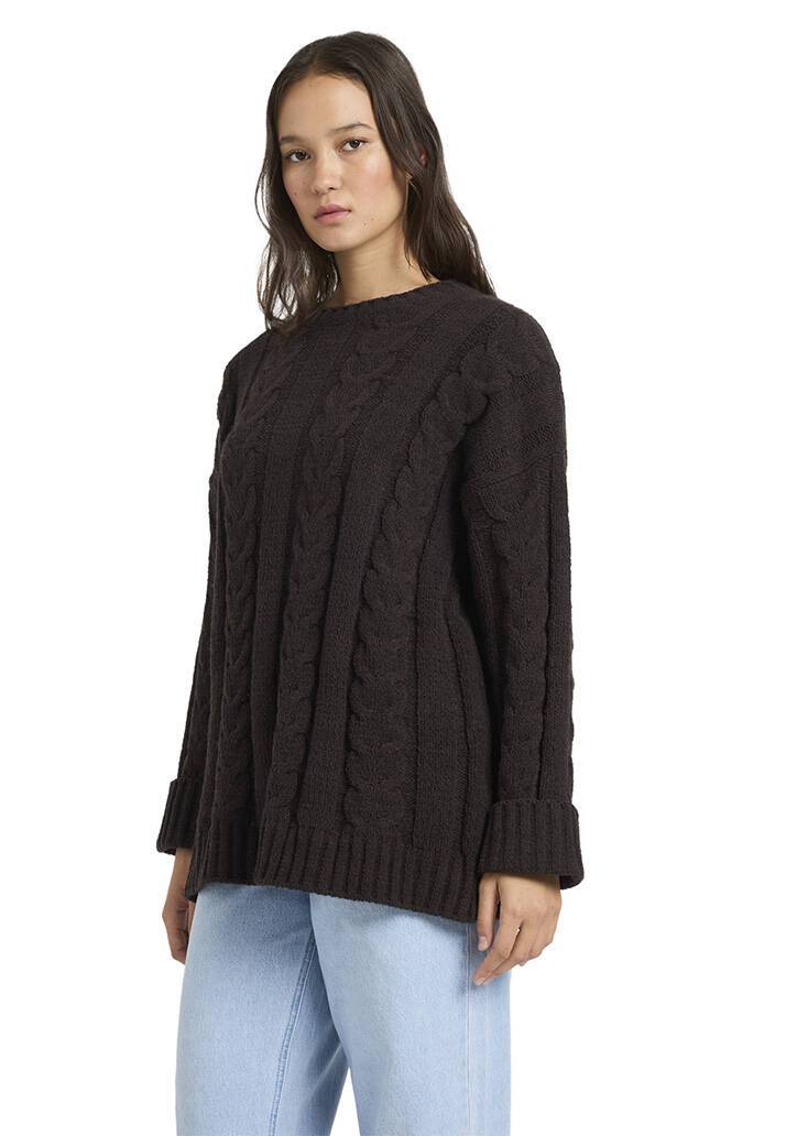 Oversized crew neck sweater with allover cable knit pattern and longer length fit