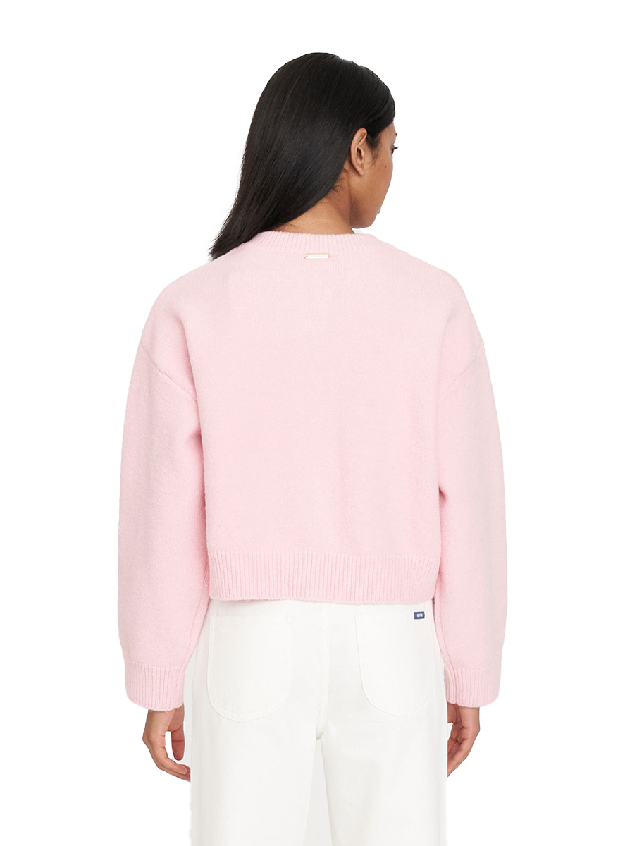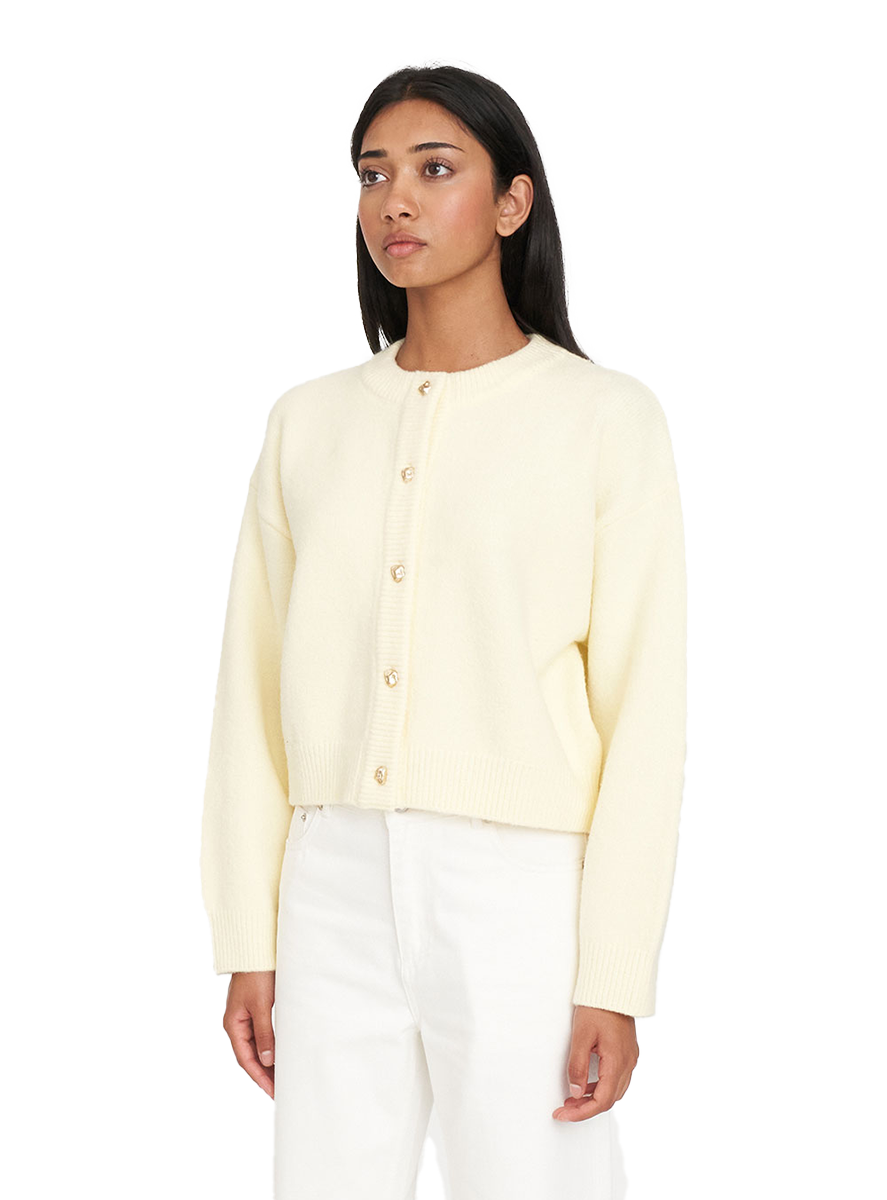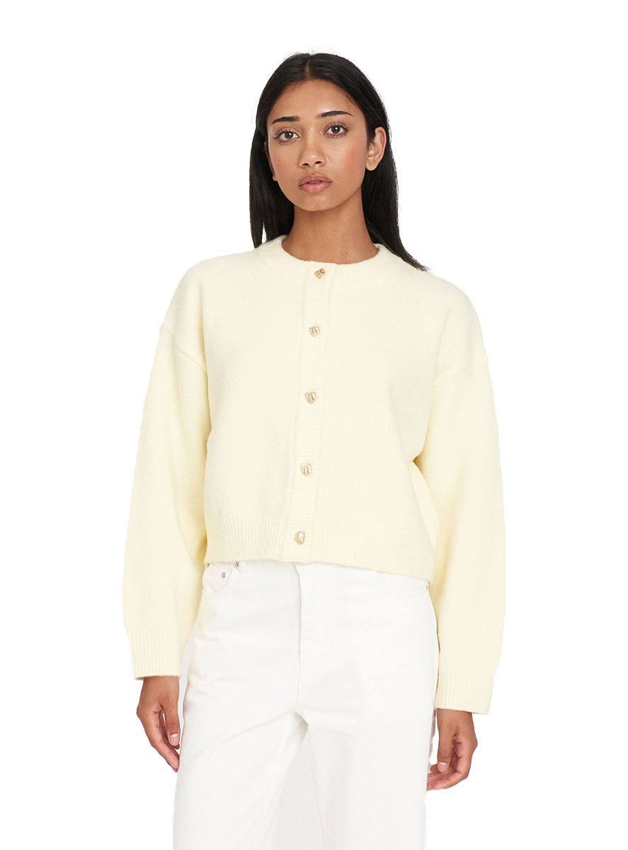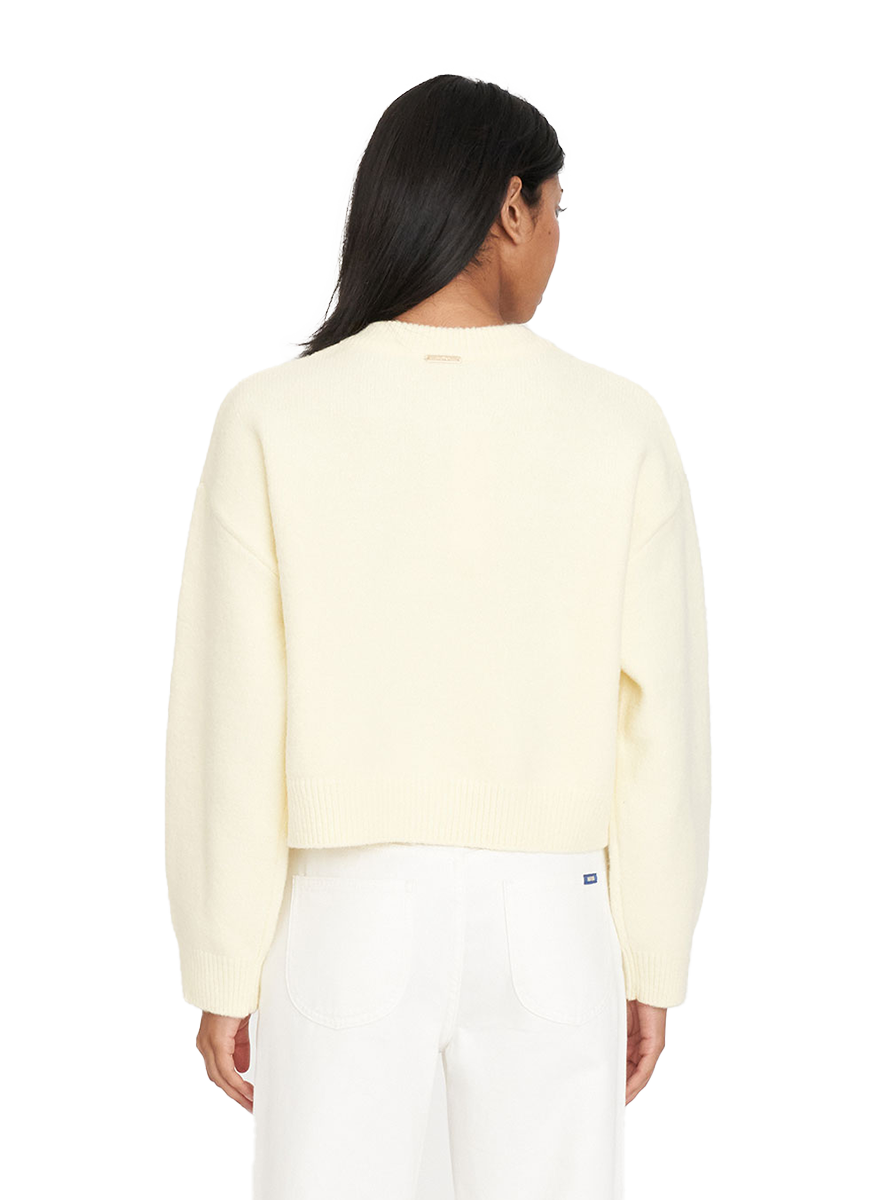 Fully fashioned knit, Relaxed fit, Crew neck, Button front placket, Straight sleeve, Huffer branded gold metal plate