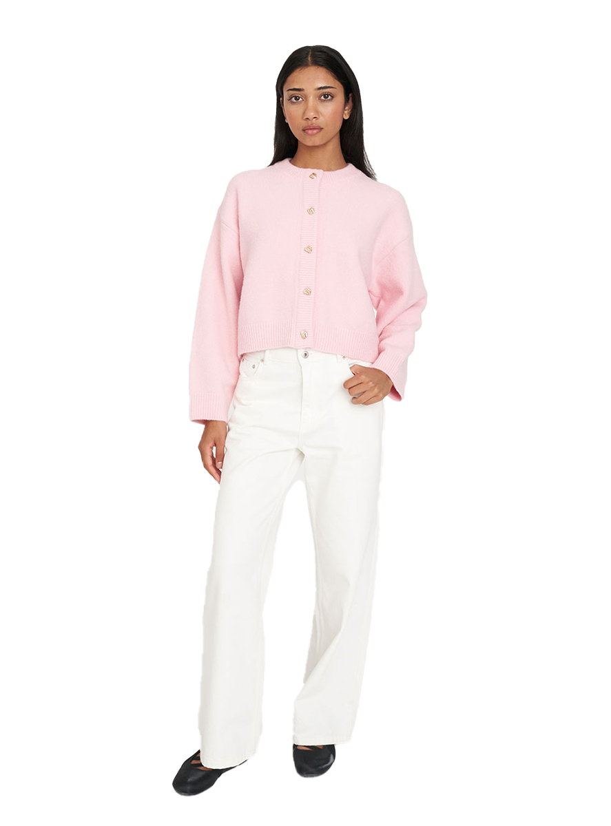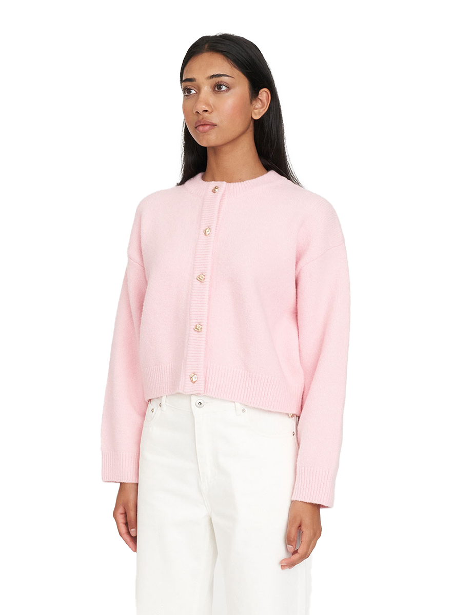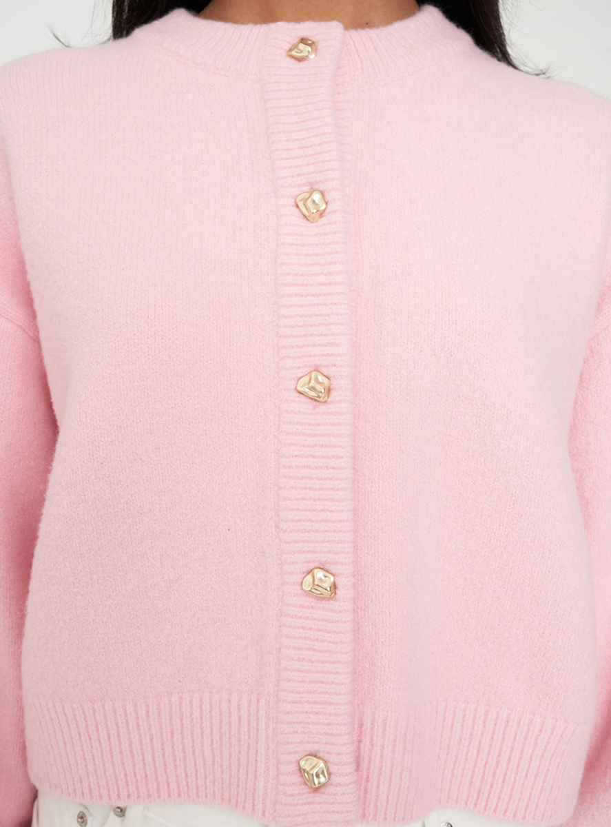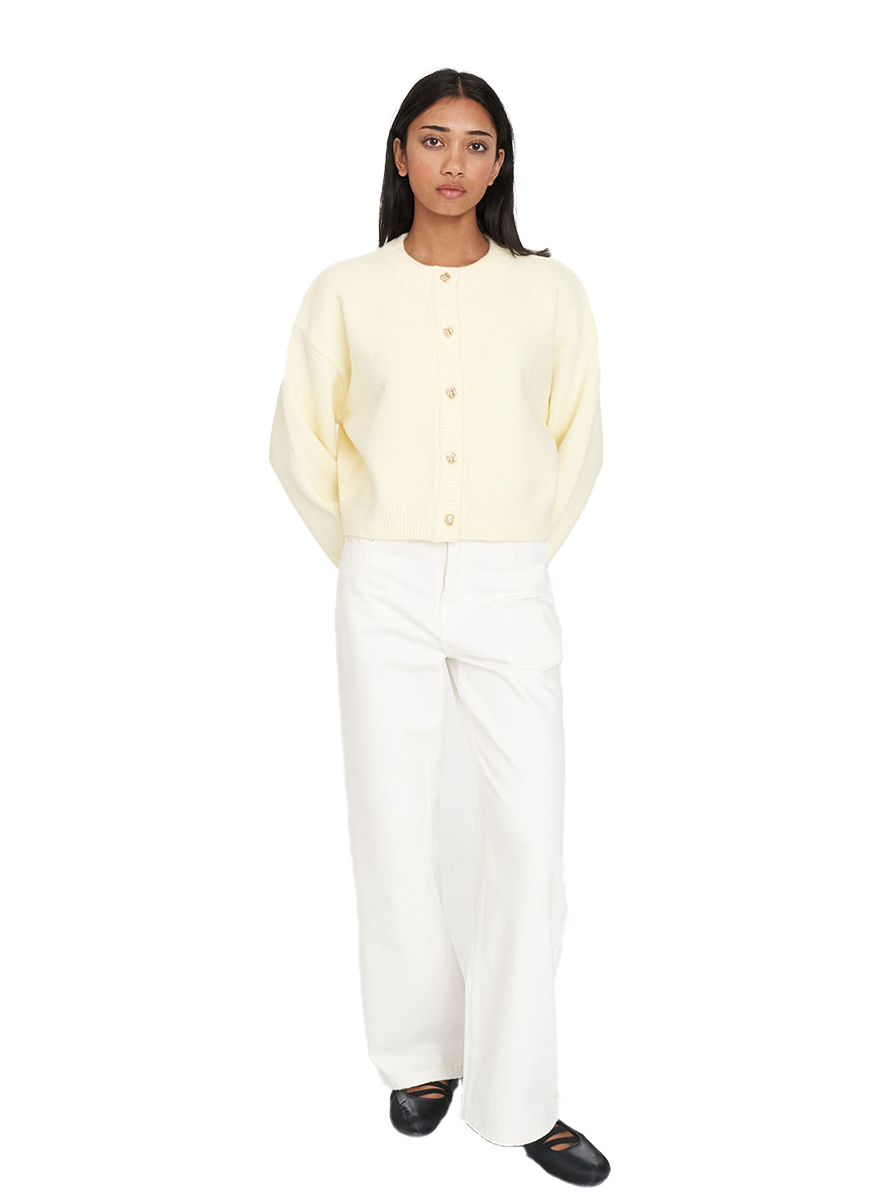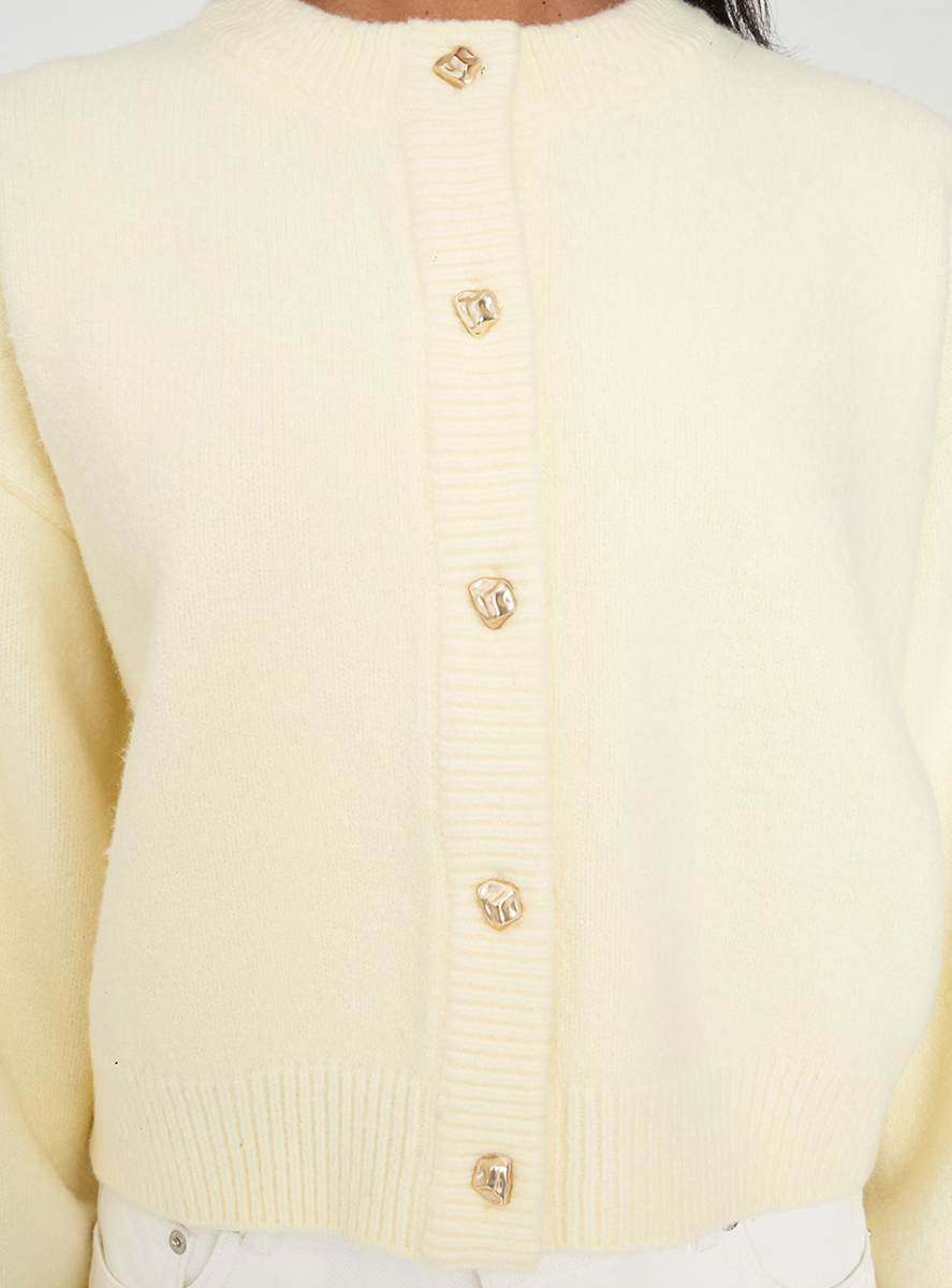Fully fashioned knit, Relaxed fit, Crew neck, Button front placket, Straight sleeve, Huffer branded gold metal plate