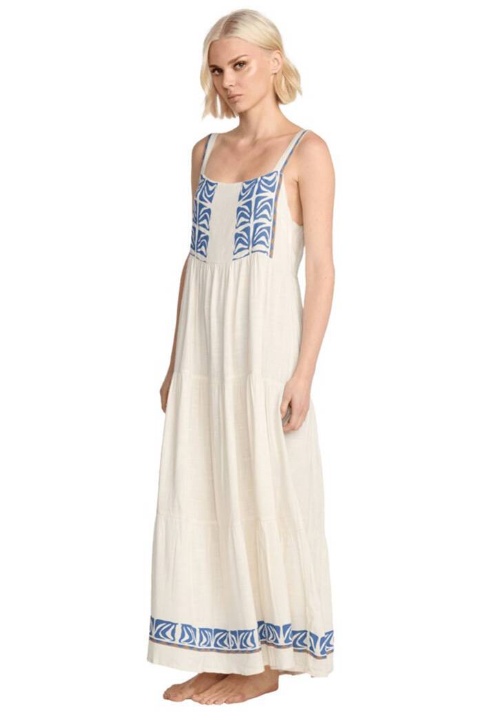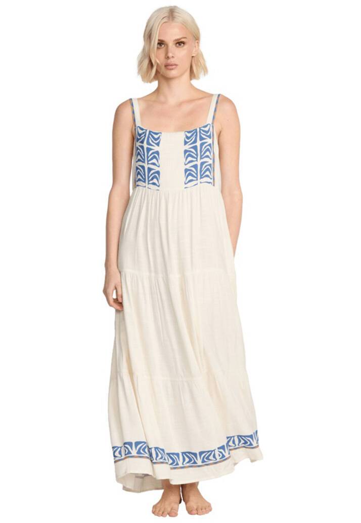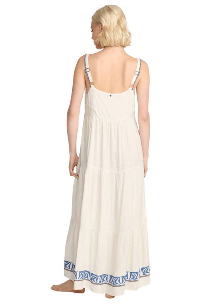 Maxi lengthTiered skirt Square neckline Adjustable thick straps Border screen print down front chest panels and bottom hem100% Viscose