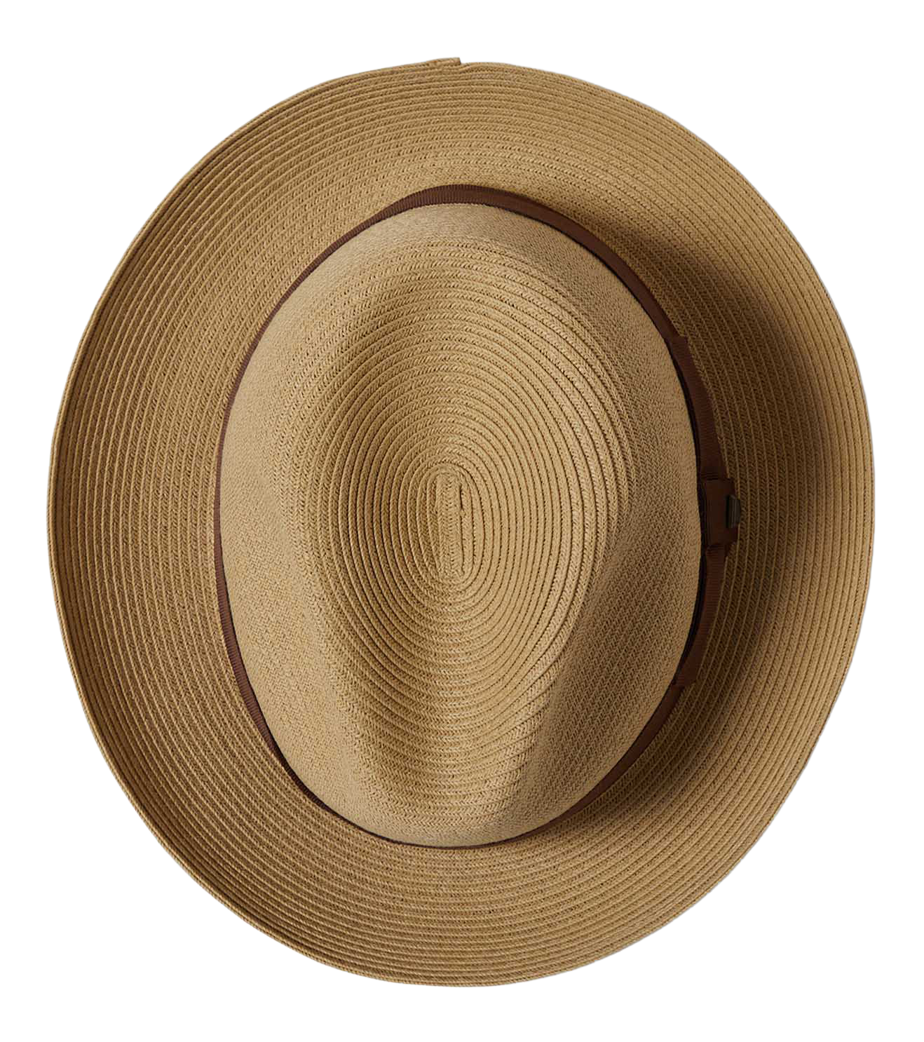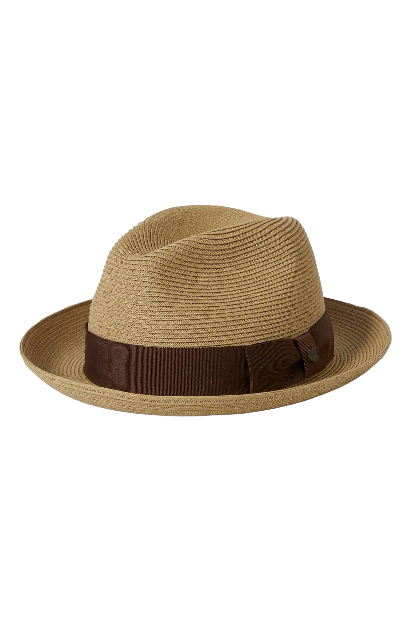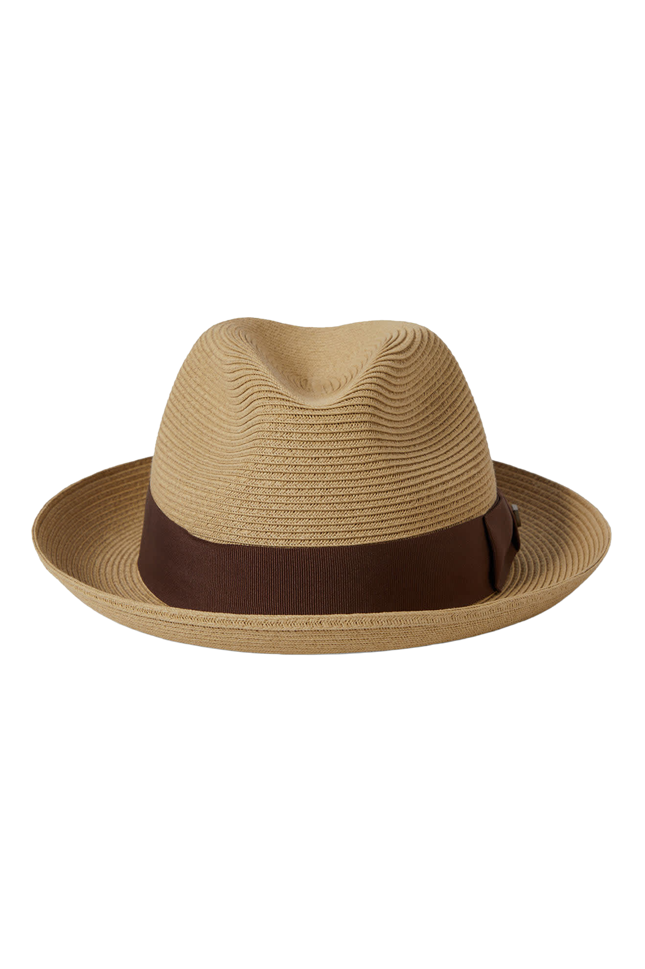 The Horton Convertabrim Packable Fedora is a travel-ready essential. Crafted from lightweight paper straw, this unisex fedora features a convertible brim that flips up or down, offering versatile styling options for any occasion. Its classic teardrop crown and grosgrain band nod to the charm of 1920s menswear, while the dark tan and light brown hues provide a neutral, earthy palette that complements any look. Designed for comfort and adaptability, the sweatband is equipped with an adjustable Velcro strap for a custom fit. Perfect for jet-setters and day-trippers alike, this fedora folds easily for packing, retaining its timeless shape wherever you roam. Finished with a metal crest pin for added sophistication, the Horton Convertabrim Packable Fedora combines practicality and style into one very cool piece.