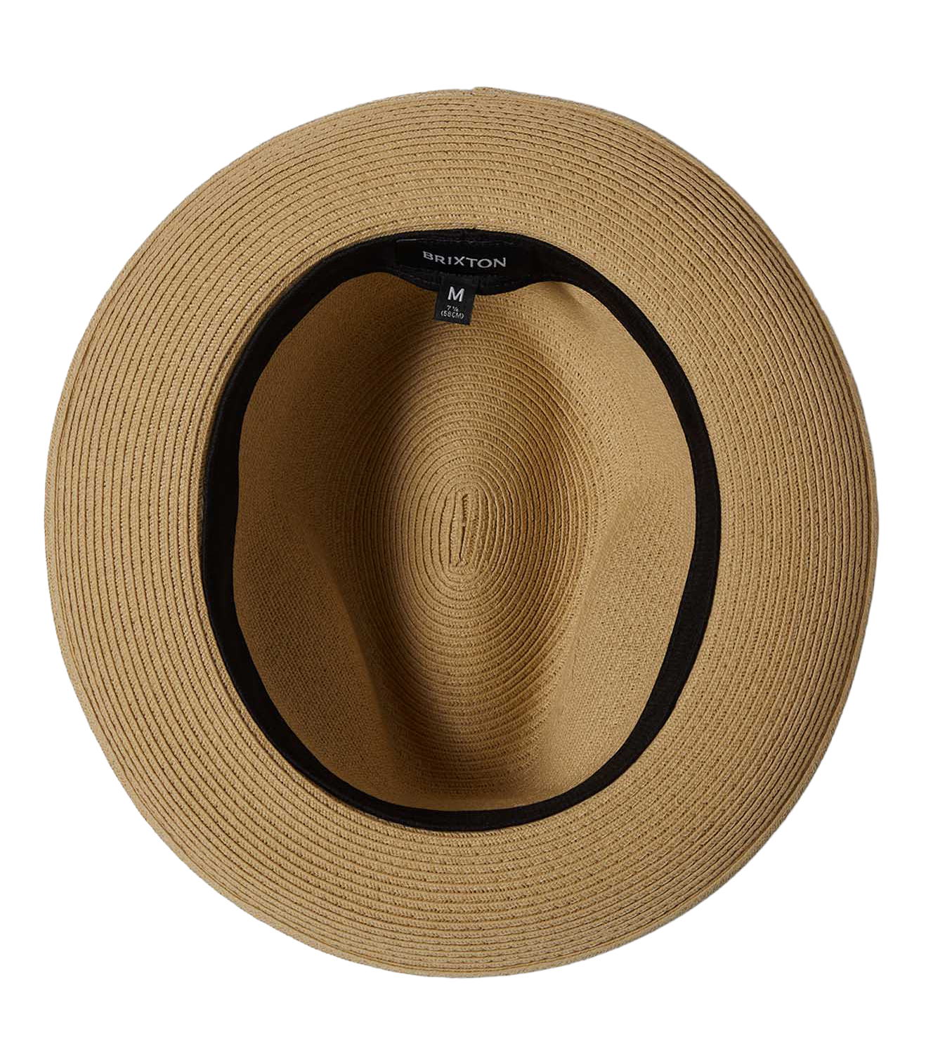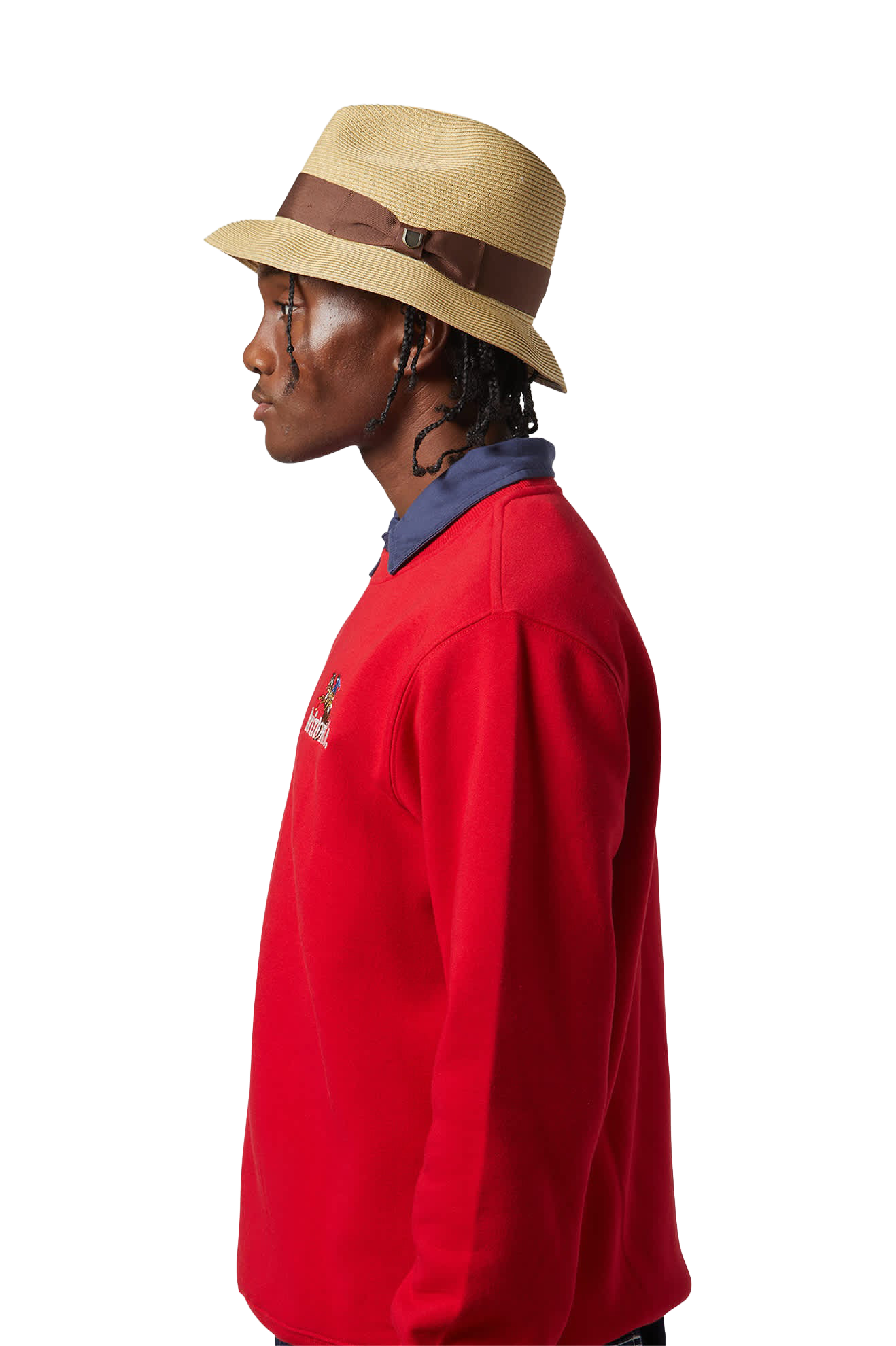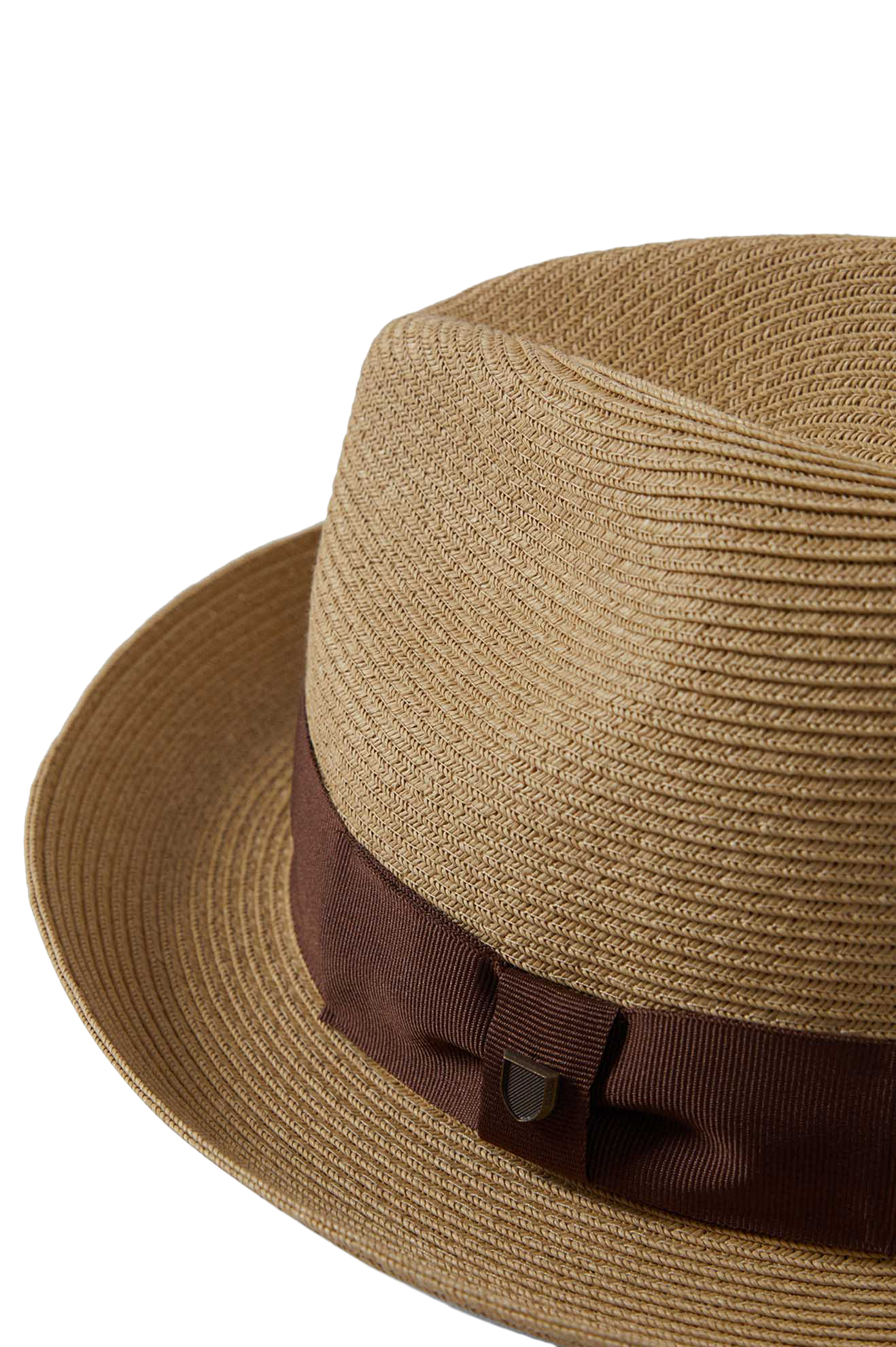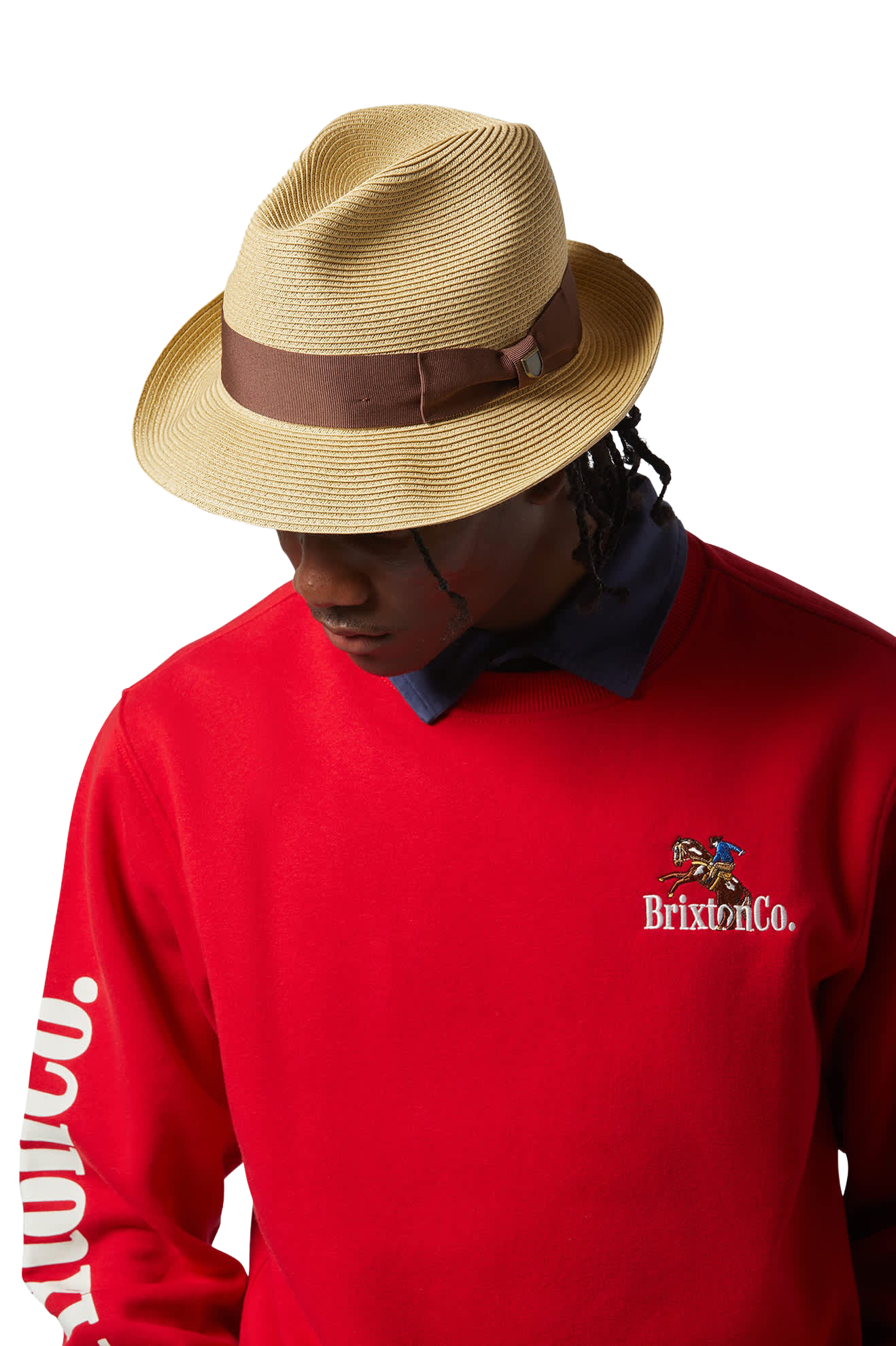 The Horton Convertabrim Packable Fedora is a travel-ready essential. Crafted from lightweight paper straw, this unisex fedora features a convertible brim that flips up or down, offering versatile styling options for any occasion. Its classic teardrop crown and grosgrain band nod to the charm of 1920s menswear, while the dark tan and light brown hues provide a neutral, earthy palette that complements any look. Designed for comfort and adaptability, the sweatband is equipped with an adjustable Velcro strap for a custom fit. Perfect for jet-setters and day-trippers alike, this fedora folds easily for packing, retaining its timeless shape wherever you roam. Finished with a metal crest pin for added sophistication, the Horton Convertabrim Packable Fedora combines practicality and style into one very cool piece.
