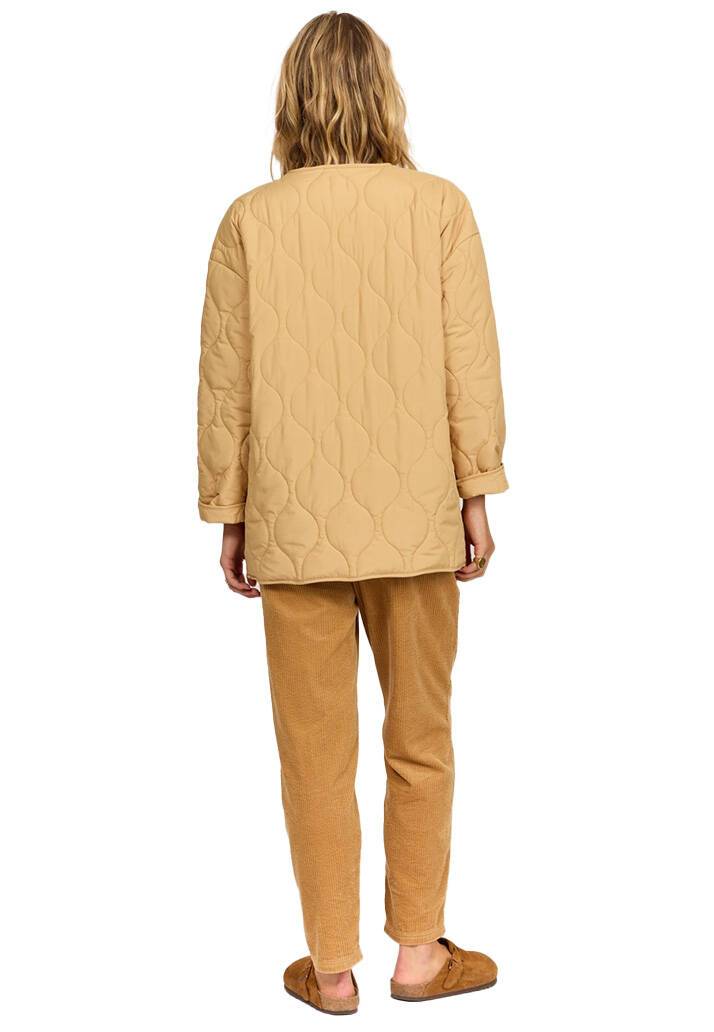 This long quilted jacket made from polyester features big, roomy pockets and snaps shut for easy wear and extra style.