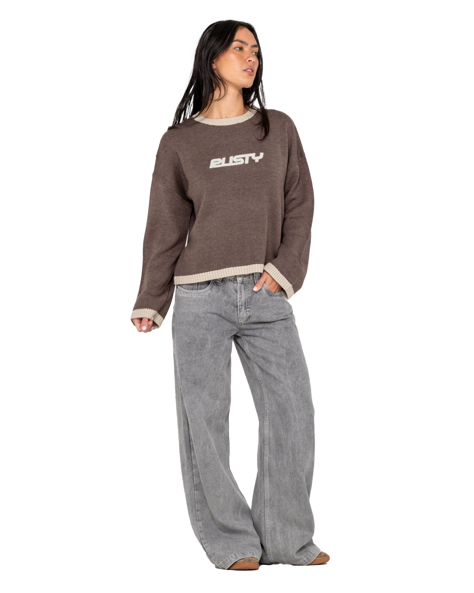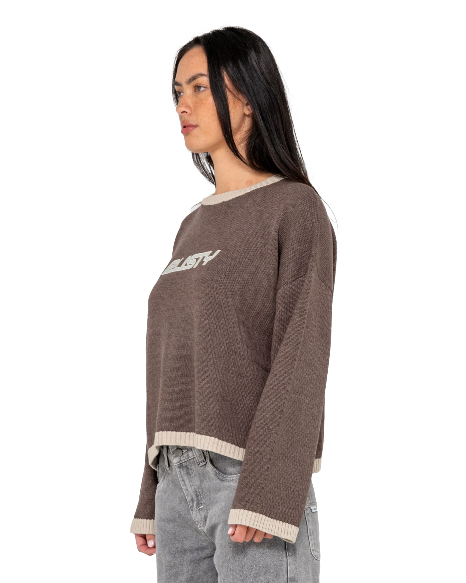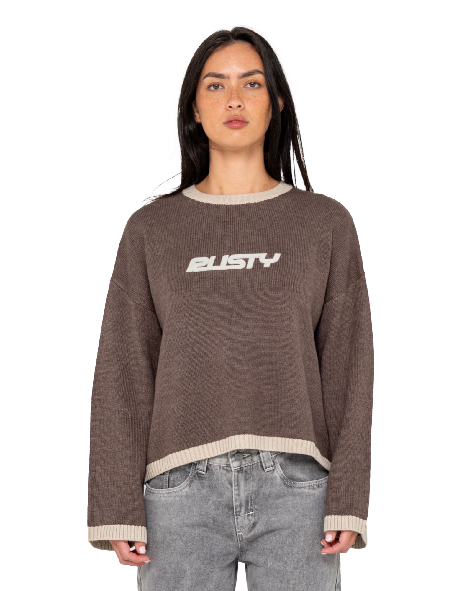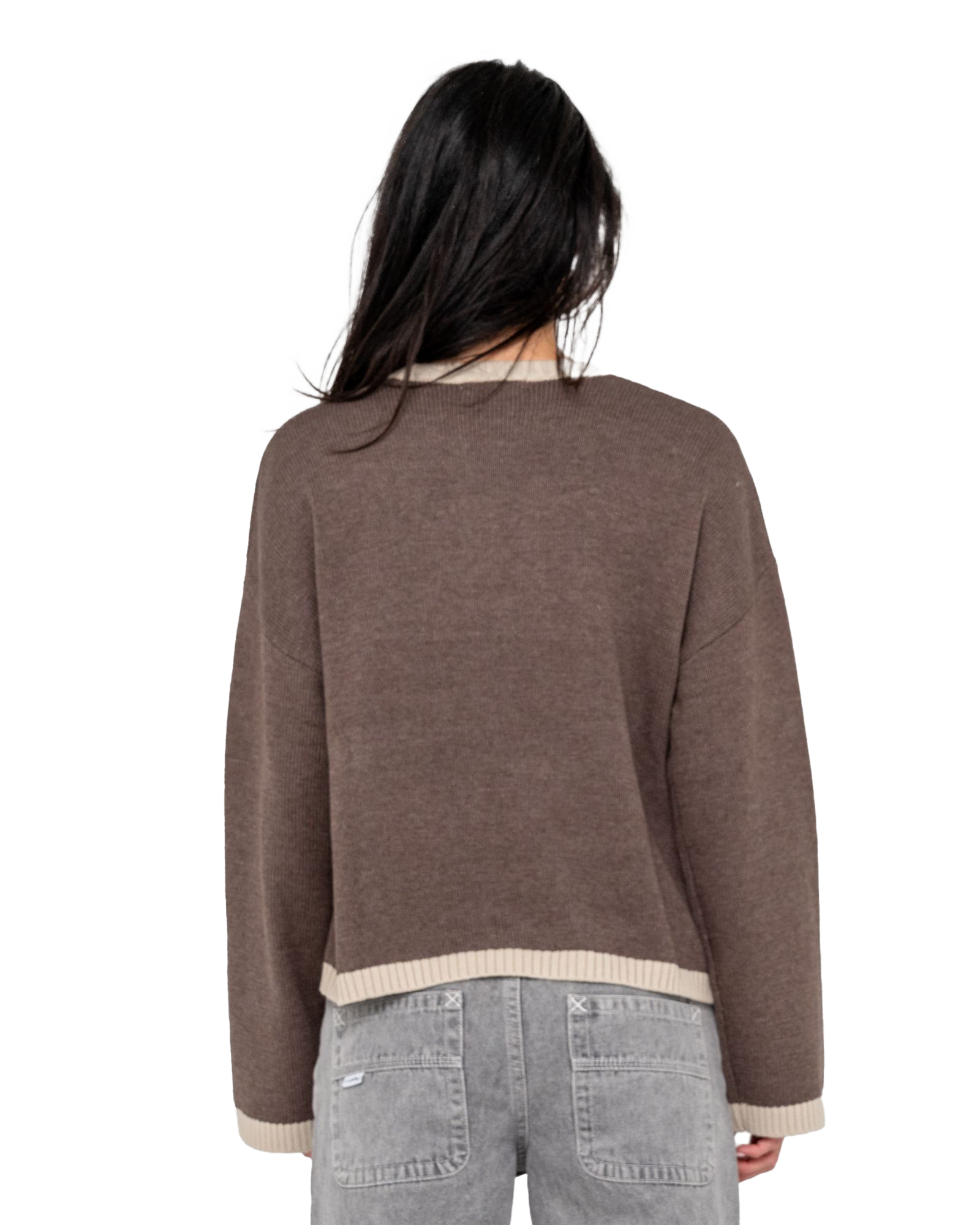 Relaxed crew neck knit with contrast cuffs & front chest embroidery
