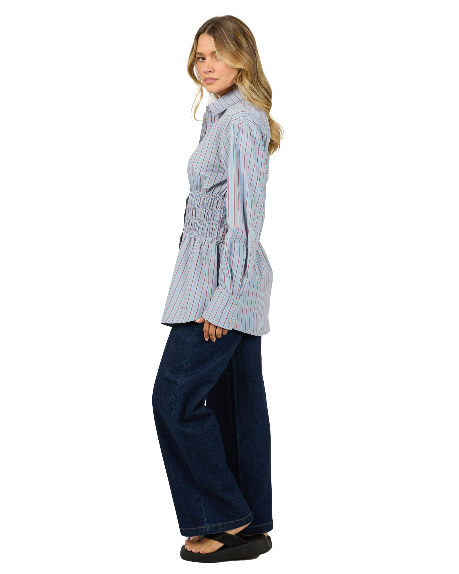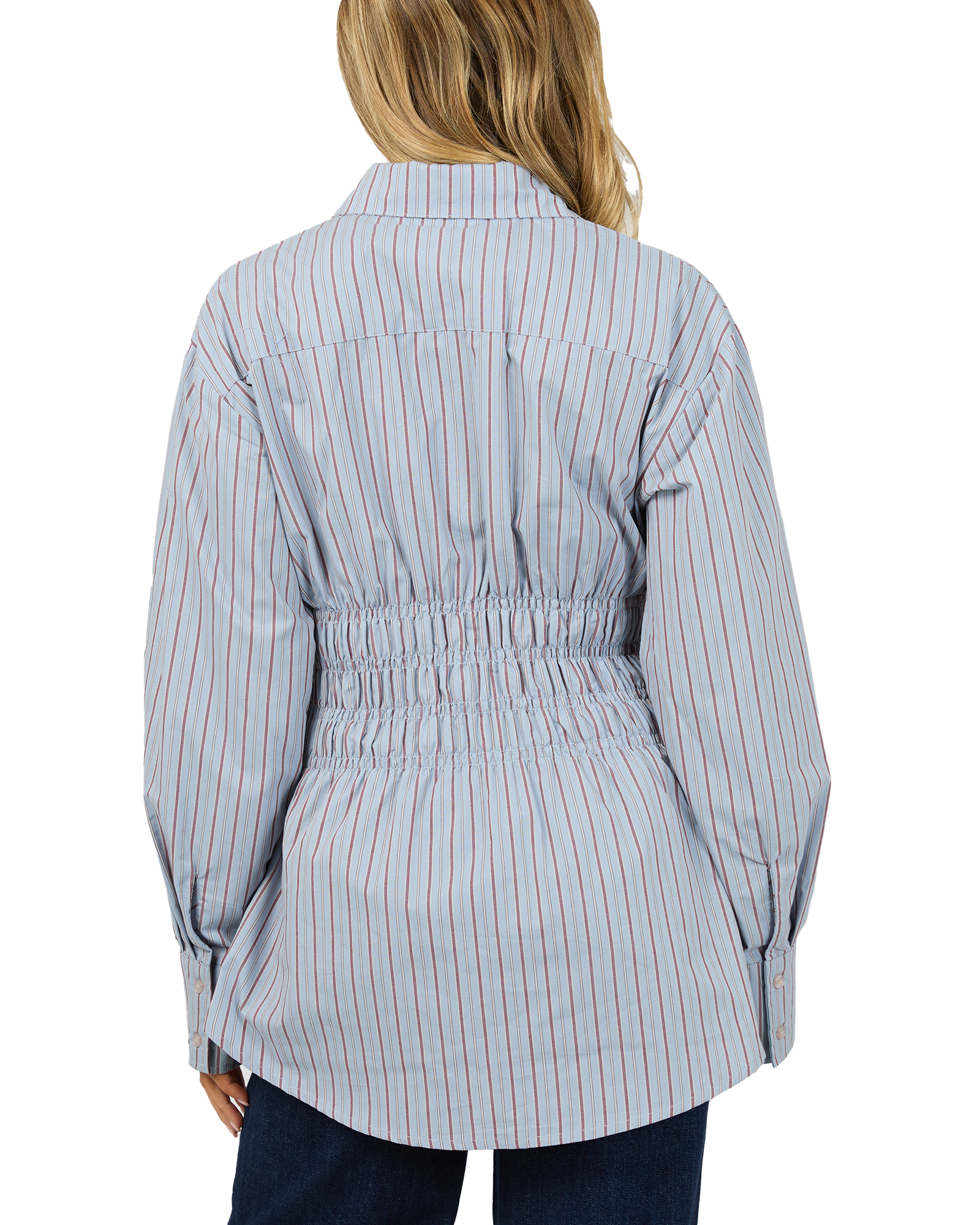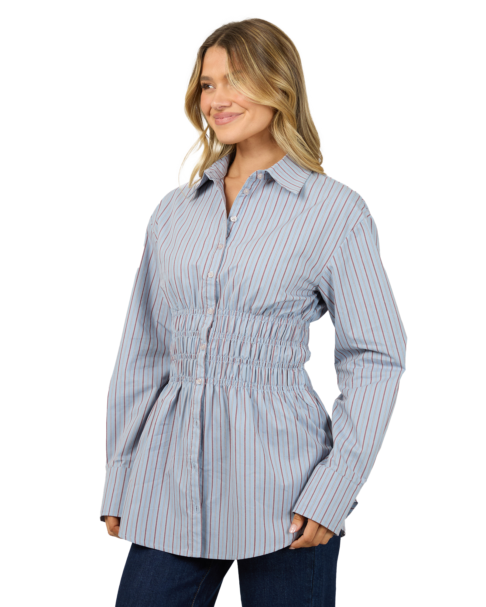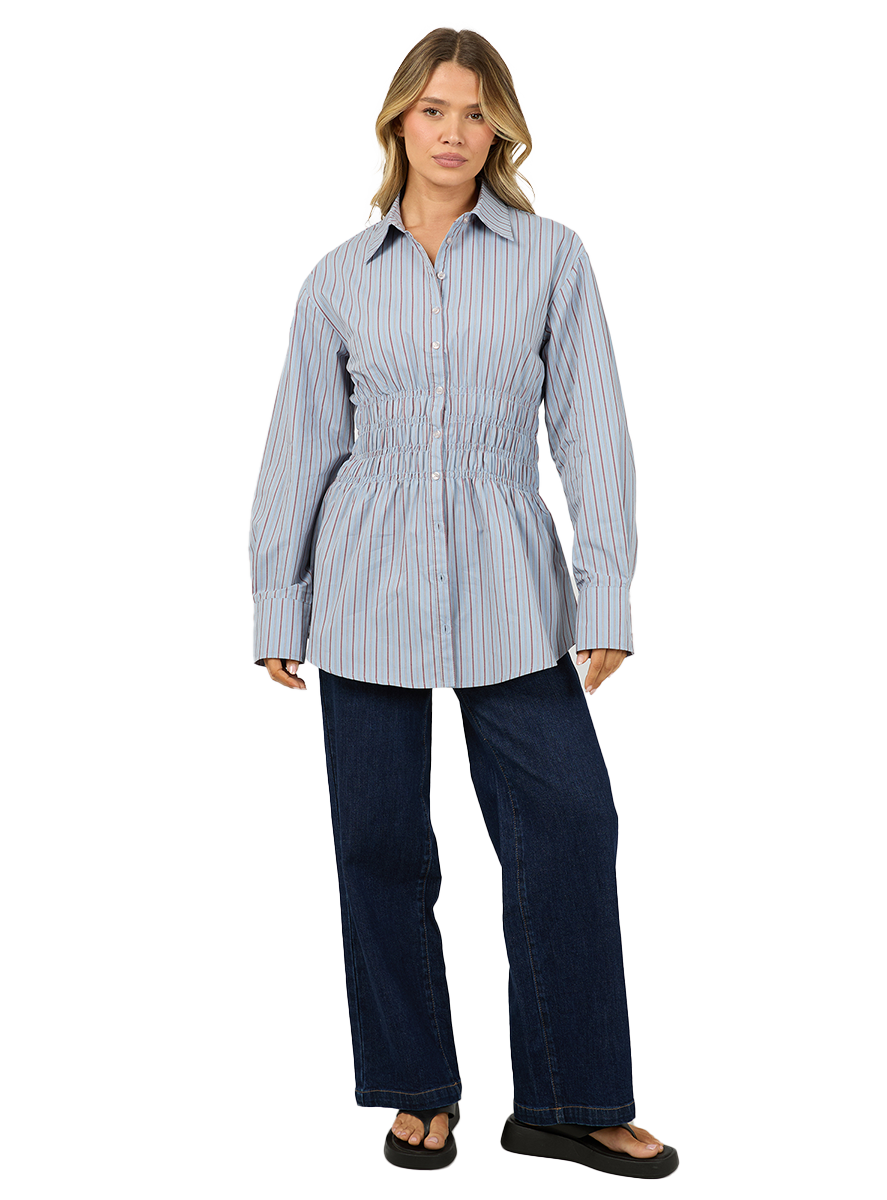 Effortlessly chic and easy to wear, this ruched stripe shirt is the perfect blend of comfort and style. Designed with a flattering cinched waist, it creates a beautiful silhouette while still offering a relaxed fit through the body. The classic button - up front and collared neckline make it easy to dress up or down, while the neutral stripe fabric adds timeless appeal.